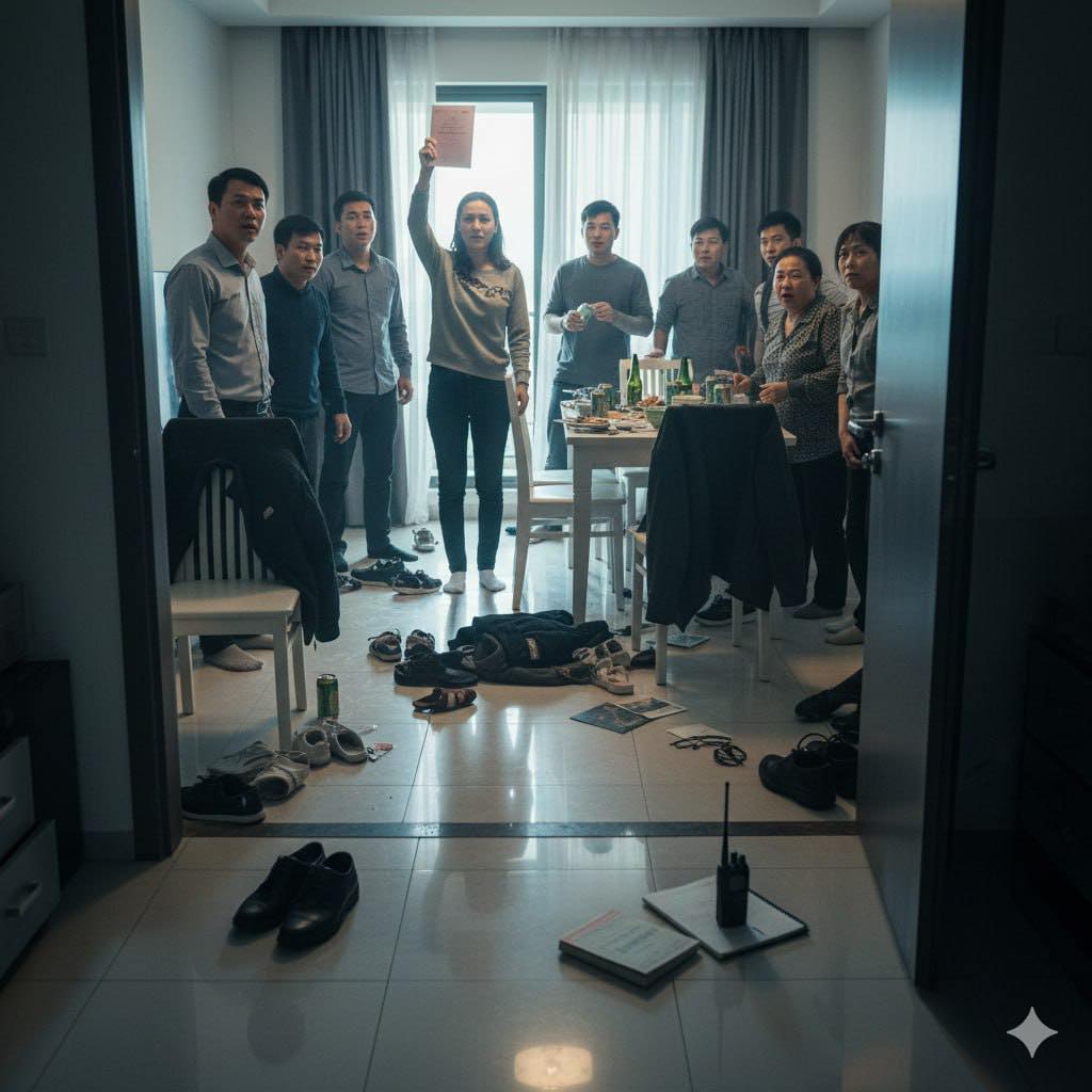 Đúng 10 giờ sáng, khi cả đoàn họ hàng đang ngồi bày tiệc giữa phòng khách, bảo vệ cùng công an gõ cửa: