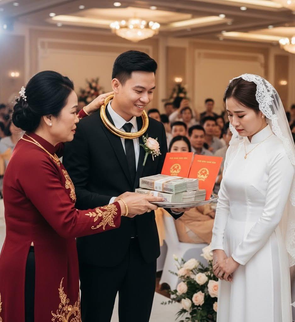 “Hôm nay là ngày trọng đại của con trai tôi – thằng Tuấn. Mẹ xin trao cho con hai sổ đỏ, năm trăm triệu tiền mặt và mười cây vàng làm của hồi môn. Mong hai con hạnh phúc, làm ăn phát đạt.”