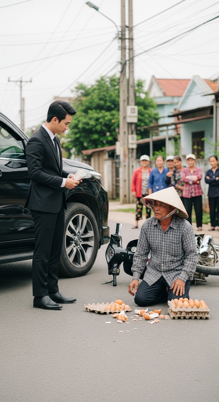 Chiếc ô tô màu đen bóng loáng rẽ gấp ở khúc cua làng, tiếng phanh “két” chói tai vang lên, rồi rầm! — một chiếc xe máy cà tàng chở hai sọt trứng lớn đổ nhào ra đường. Trứng vỡ nhoe nhoét, vàng trắng loang lổ giữa nắng trưa.